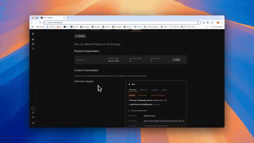 **Playbooks** are key to achieving higher conversion rates through effective pain discovery. For each meeting you have, Rox will search sales enablement playbooks, filter them for relevancy, and extract information depending on who you are meeting with — analyzing down to each attendee and tailoring insights and discovery questions based on their specific job titles and experience.