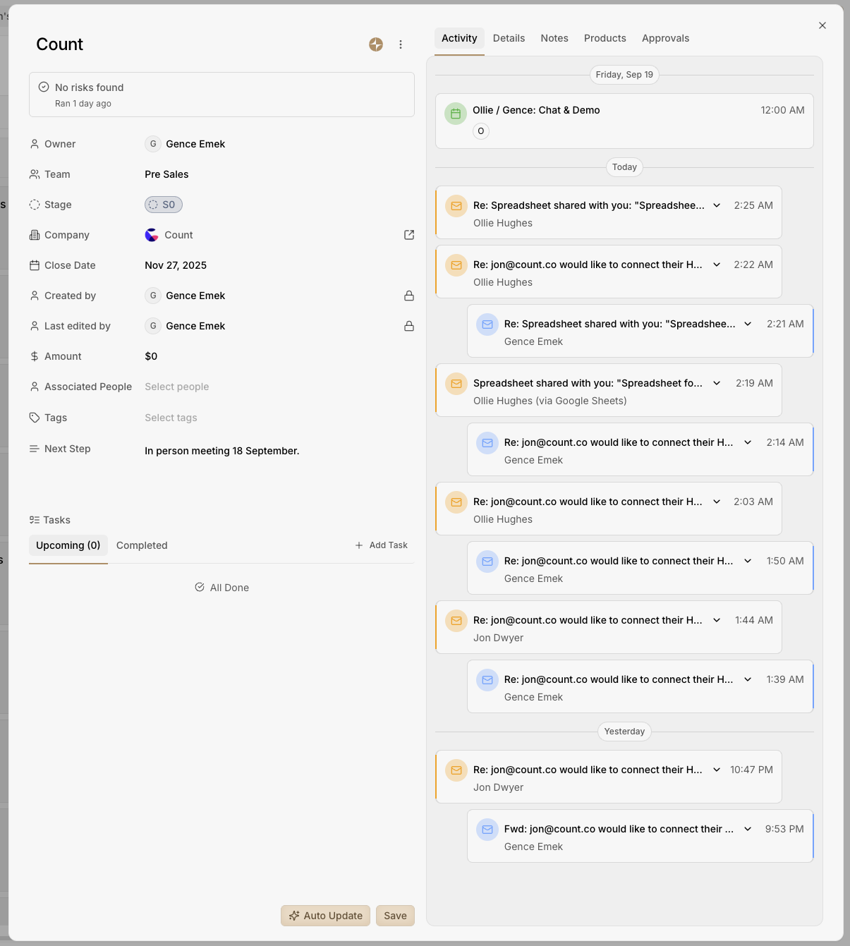 Connect your calendar and email to Rox and let our agent swarm do its magic! View all the activity (emails, meetings, call transcripts) related to an opportunity in the Activity tab and stay on top of an account