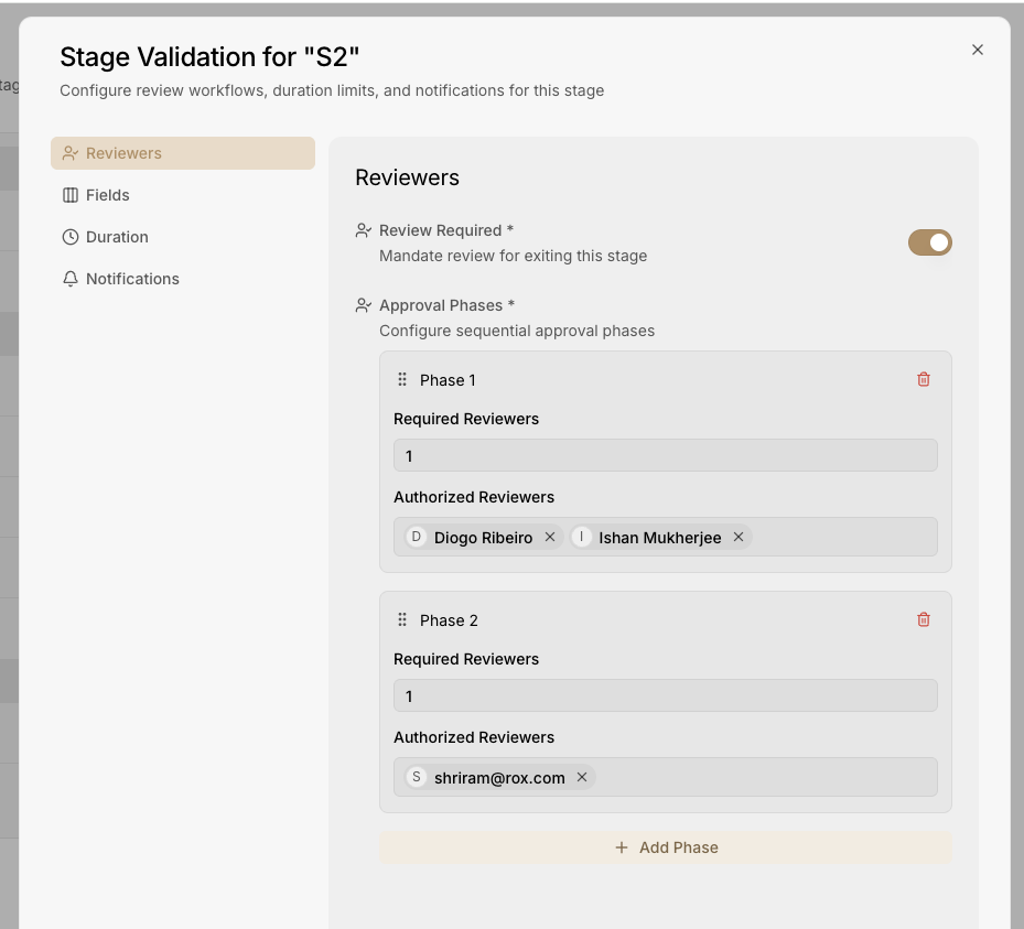 In this example, an approval from either Diogo or Ishan will complete the Phase 1 of approvals