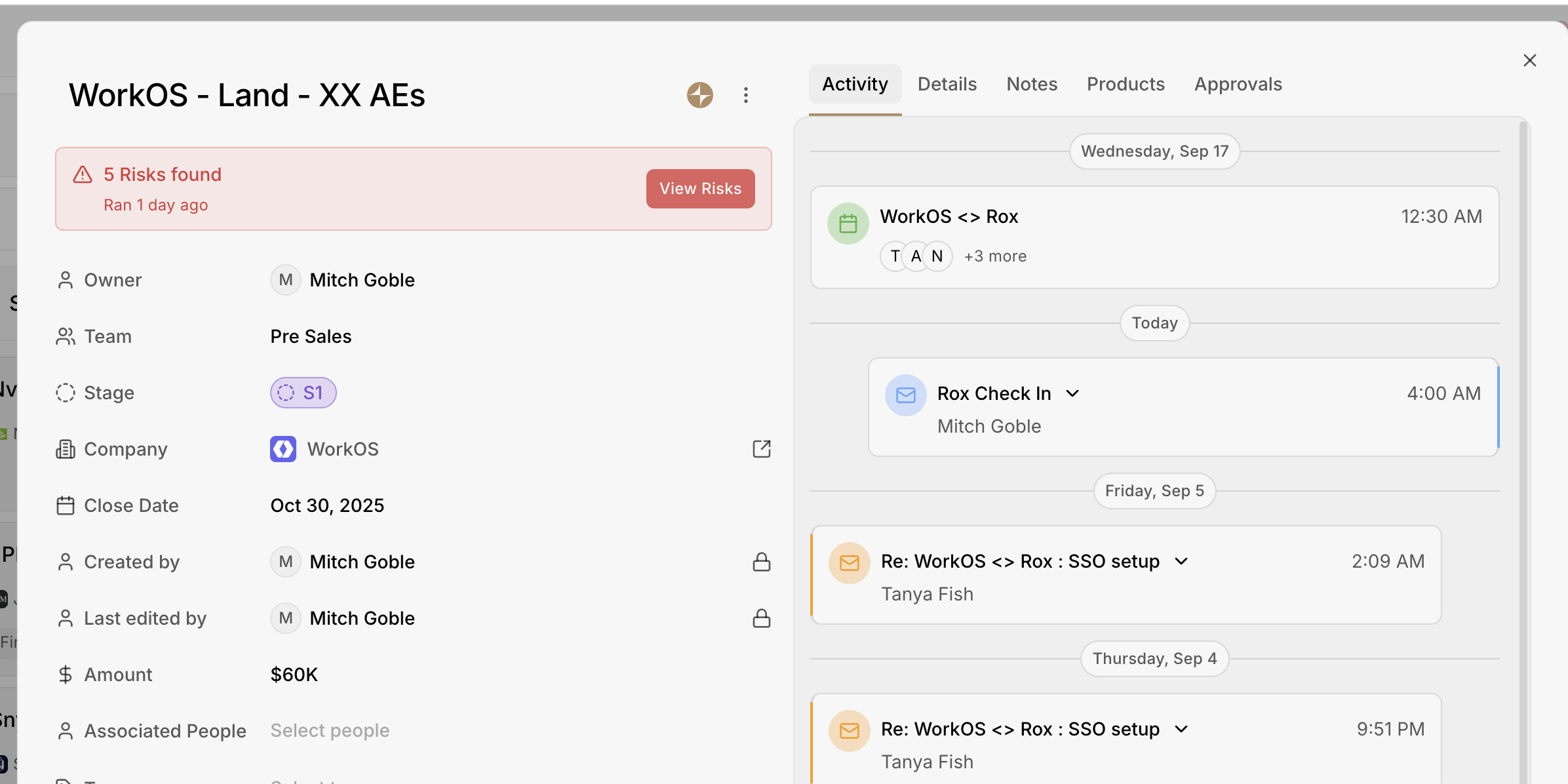 You can mark a flagged risk as resolved once it is addressed. The Rox Agent also **intelligently maps the source of the risk**, saving valuable time by providing accurate context so that sellers can focus on taking action.